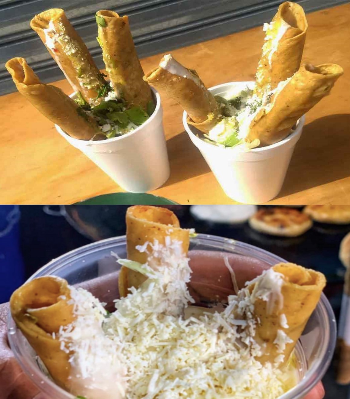 Las básicas flautas con papa, queso rallado, crema y salsa verde con la nuestra receta secreta.